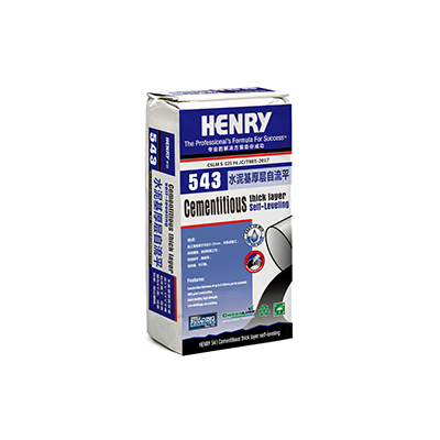 HENRY 543 Cementitious thick layer self-leveling, with the special cement, fine aggregate, polymer resin and other additives of cement powder spray, the product has good mobility , can fast automatic leveling the ground, a construction thickness of up to 5-25mm at room temperature, can walk after 6 hours, When the self leveling is completely dried, the next process can be carried out, shorten the construction period, can be directly in the ground paving tile, wood flooring, carpet, flooring and other materials to provide all kinds of elastic ground leveling intact, solid ideal base, non-toxic and harmless, green environmental protection products.